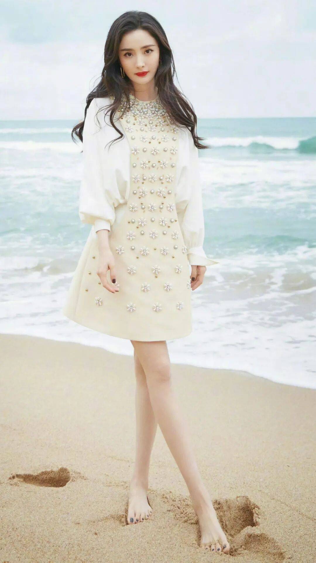 她好像看透了名利场那种你追我赶的繁华游戏,开始“向内生长”了。以前她的美,是那种带着攻击性的、需要被所有人看见的锋利的美,像一把宝剑。现在呢,更像一块温润的玉,自己舒服最重要。米白色的挂脖纱裙,上面点缀着细碎的羽毛和珠饰,看着简单,但光影打上去,裙摆会有一种流动感。她没弄什么精致的盘发,就一头微卷长发半扎着,碎发贴在颈窝,营造出一种“不刻意”的慵懒。妆容也是裸色系,放弃了标志性的红唇。整套造型,没有拼命往“仙女”那个路子上靠,反而揉进去一点中性的飒爽,被说成是从油画里走出来的“贵公子”。这种转变,哪里是摆烂,分明是中年女性最通透的活法——不再被外界审美绑架,而是把穿搭变成自我表达的武器。